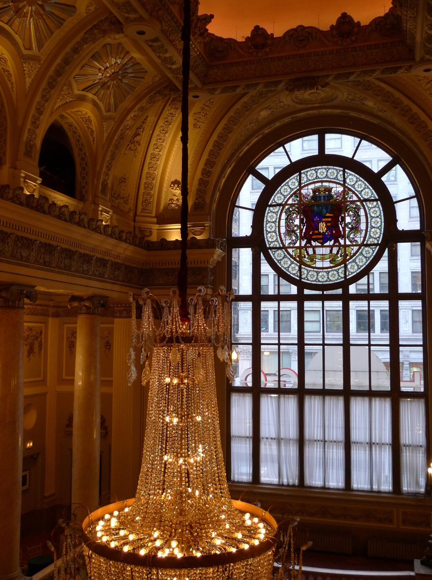 Here you can see the massive chandelier in the lobby, as seen from the third floor, along with a grand window in which is set a glass panel bearing the coat-of-arms of the Balaban and Katz theater chain (two horses holding ribbons of 35-mm film in their mouths), and a tiny fragment of ever-color-changing glass ceiling, here displaying a wonderful peach hue. You can find a more detailed photograph in which the ceiling takes on celestial blue on my Facebook page.