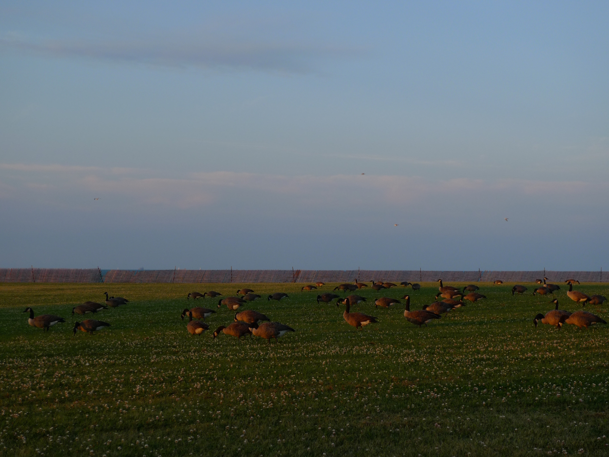 A flock of giant Canada geese on the shore of Lake Michigan at sunset. Believed to be extinct in the 1950s due to over-hunting and loss of habitat, they were rediscovered in 1962 in Rochester, Minnesota, and subsequently reintroduced throughout North America. As often happens in such cases, the geese population got slightly out of control. With lack of natural predators and a lot of easy accessible food sources (think public parks and beaches), not to mention people directly feeding them, the geese gradually stopped migrating and became a year-round feature of urban areas.